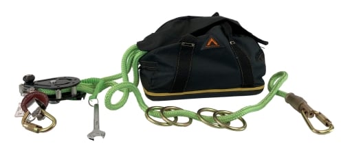 The Malta Dynamics temporary horizontal lifeline is made from a high-strength poly-rope that spans between two anchor points to create an anchorage system that allows multiple workers to tie-off safely. The temporary horizontal lifeline bag comes as a complete system that includes a tensioning device, energy absorber, rope, steel O-Rings, self-locking carabiners, and cross arm straps.
